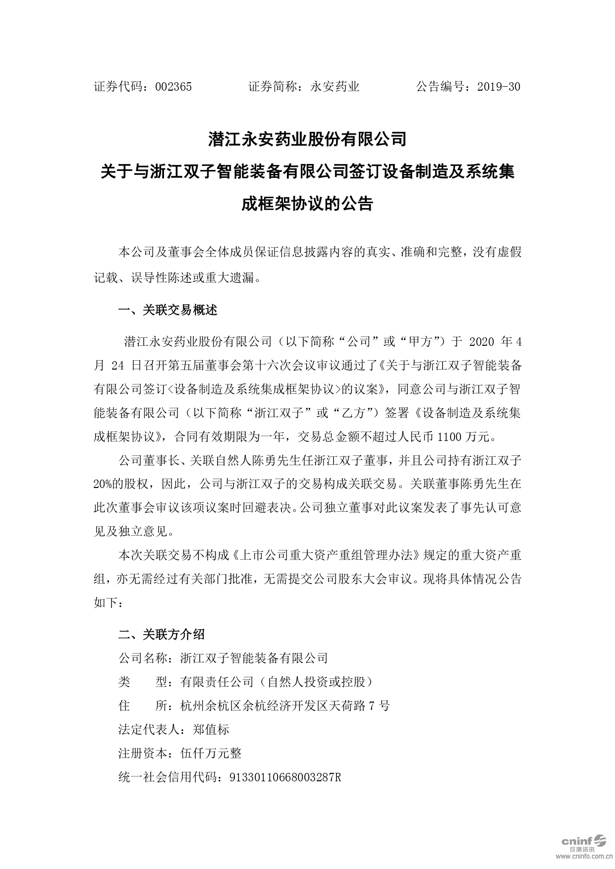 關(guān)于與浙江雙子智能裝備有限公司簽訂設(shè)備制造及系統(tǒng)集成框架協(xié)議的公告